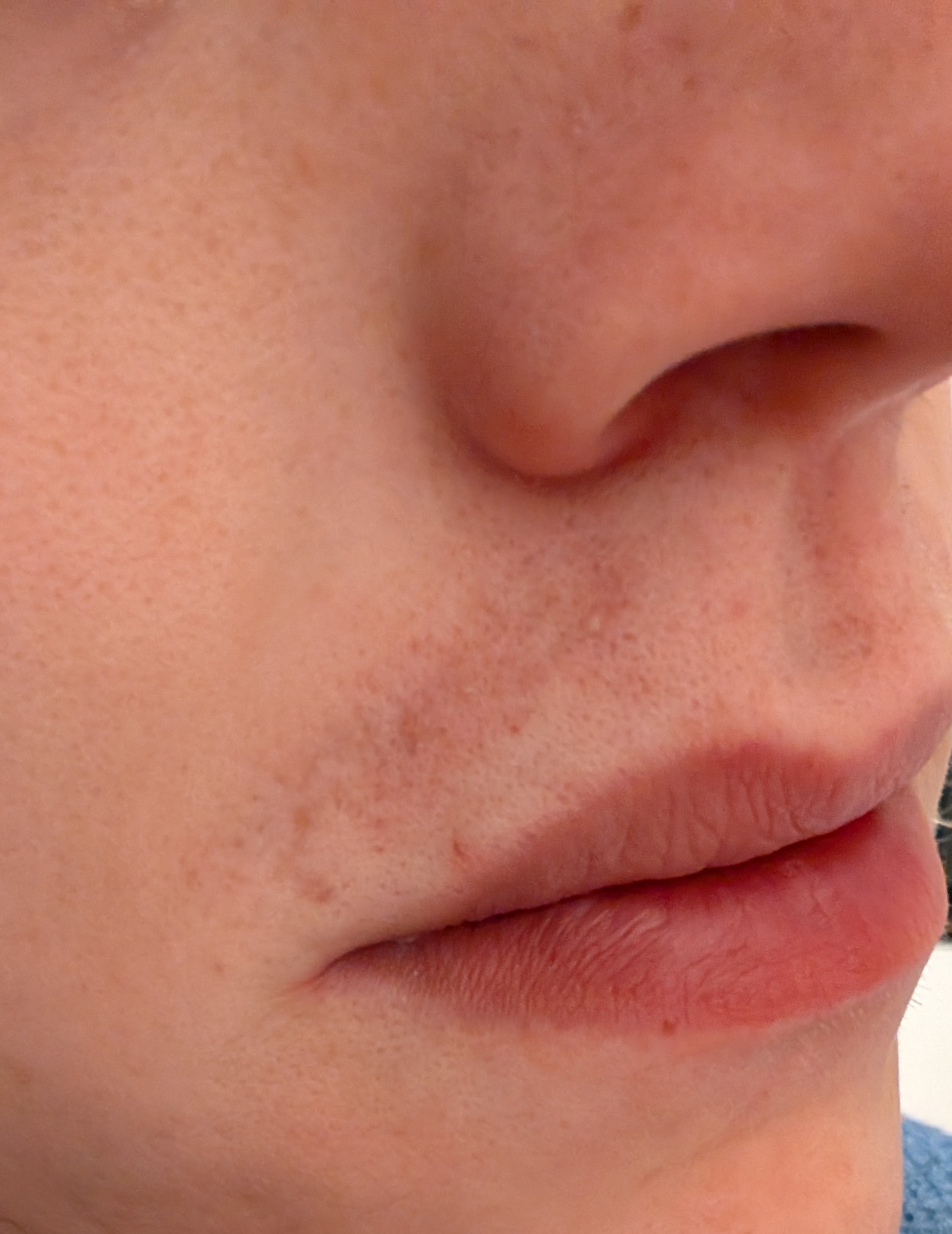 It’s been a little over a month since my last electrolysis treatment on my upper lip. I had been getting treatment for about six months prior, once ever week or so for 30 minutes. I would usually get some minor scabbing after appointments, but small enough that I could find examples of people posting about similar experiences and getting the response of “it isn’t a big deal.” I was seeing some buildup of persistent redness and pitting, but regrettably kept pushing through (I could only find one electrolysist in my area, so told myself there wasn’t another option). I finally threw in the towel a month ago and decided to sort my skin out before getting any more treatment. Below is what my lip looks like after that month.