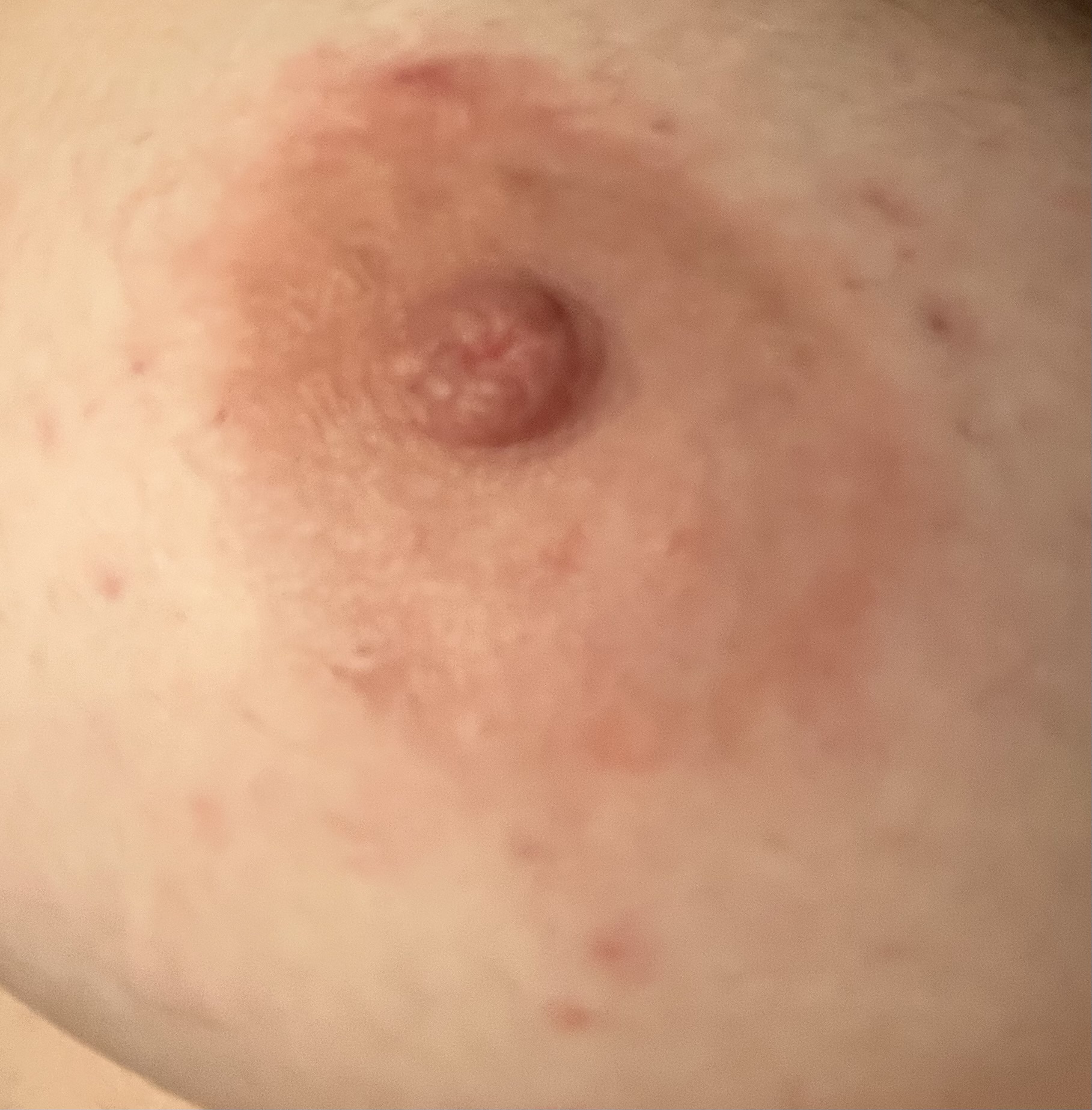 Also, on two occasions I’ve had an odd irritated hair follicle that won’t heal for months. I’m dealing with one currently that has been infected for at least 4 months. It has not healed and doesn’t seem to have an in-grown hair in it. I’m not sure if this something anyone has ever seen? The following photo shows the irritated region - it’s at the top of nipple.