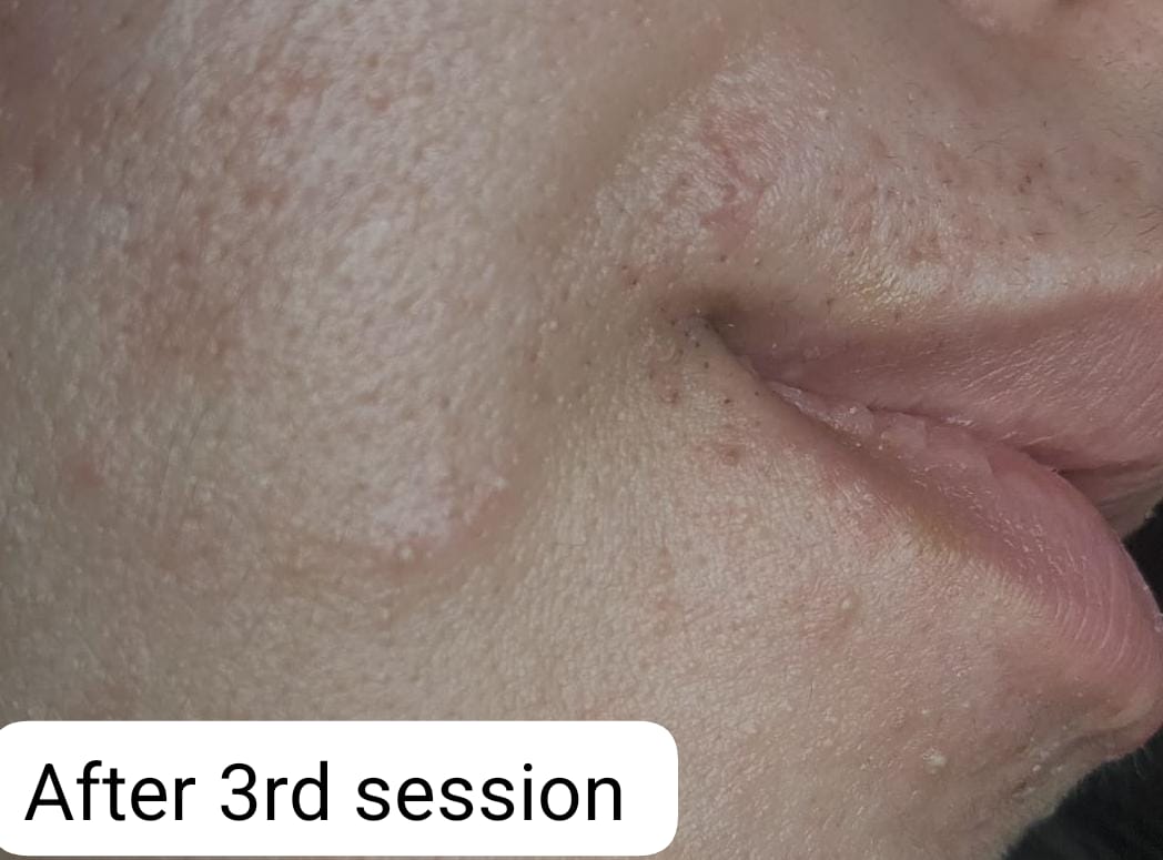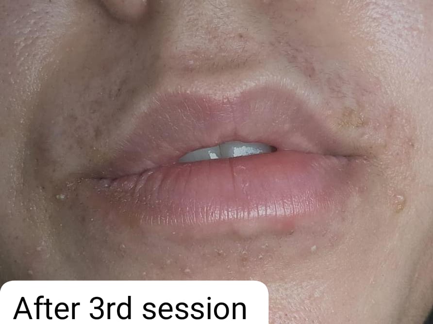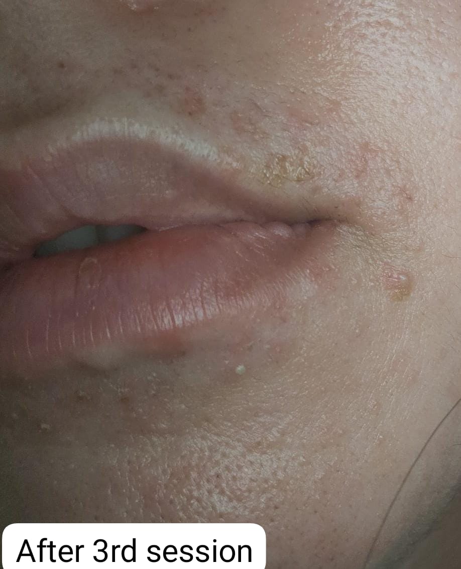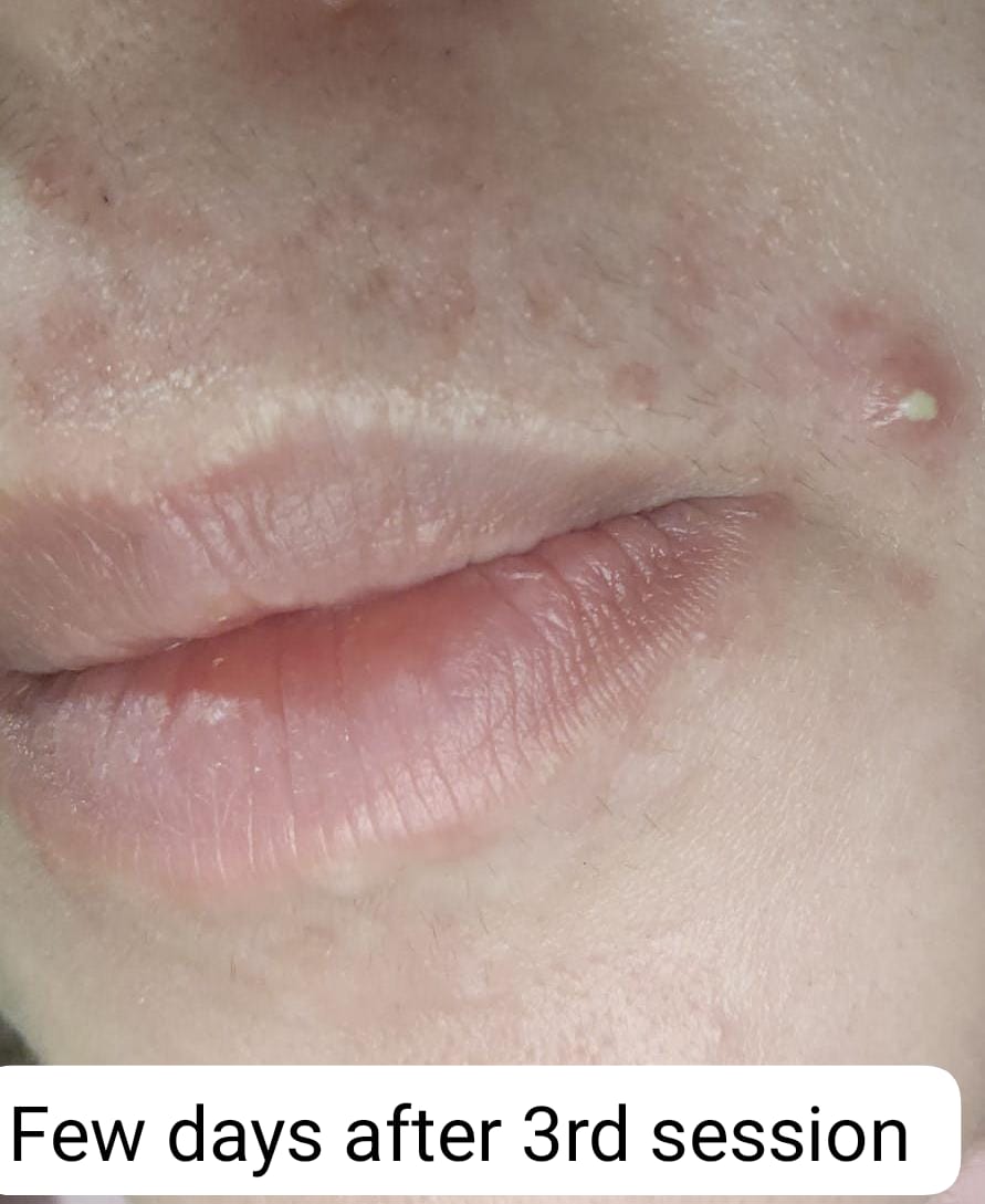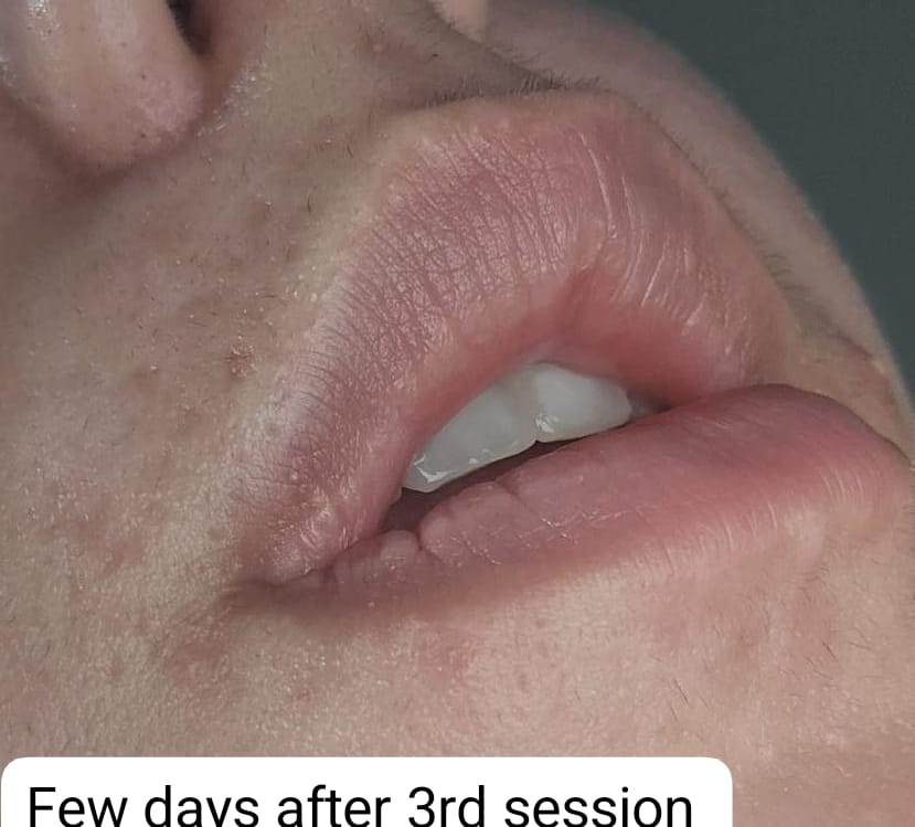 Immediate Reaction after 3rd session: My entire upper lip, under lip, and eyebrows were incredibly swollen and hurt like I’ve been punched for days. Right after the session, the skin was weeping clear/yellow fluid serum just right after.